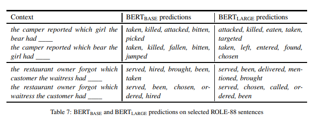 预测检查的定性分析 表 7 显示了 BERT(BASE) 和 BERT(LARGE) 对一些示例的预测。对于“girl/bear”项目,我们看到 BERT(BASE) 倾向于以“bear”为主题的“killed”和“bitten”等的延续,但也包含以“girl”为主题的这些延续。相比之下,BERT(LARGE) 排除了以 girl 为主题的延续。