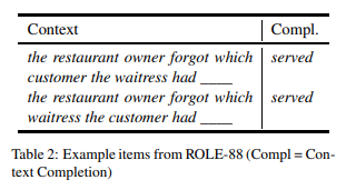 所需信息的预测 对这个集合的预测需要一个模型来解释句子语法中的语义角色,并应用事件知识来了解给定角色中实体类型之间的典型交互。该集合对每个名词对都有倒转(如表 2 所示),因此模型必须区分每个顺序的角色。