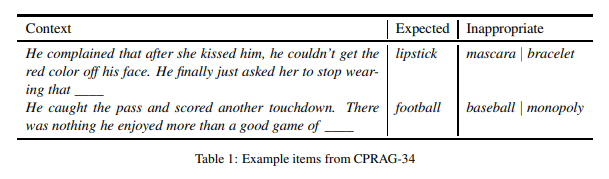 预测所需信息 对这一集合的准确预测需要使用常识来推断第一句中所描述的内容,并使用语言推理来确定与第二句的关系。例如,在表 1 中,常识告诉我们,吻留下的红色表示唇膏,而语用推理告诉我们 stop wearing 与 complained 有关。就像 LAMBADA 一样,最后一句是通用性的,不支持自己的预测。与 LAMBADA 不同,这些项的一致结构允许我们以特定的模型功能为目标,此外,这些项中没有一项包含上下文中的目标词,这迫使模型使用常识性推理而不是引用。人类完形填空概率表明,对这些项适当的完成展示出很高的一致性。期望完成的平均完形概率为 0.74。