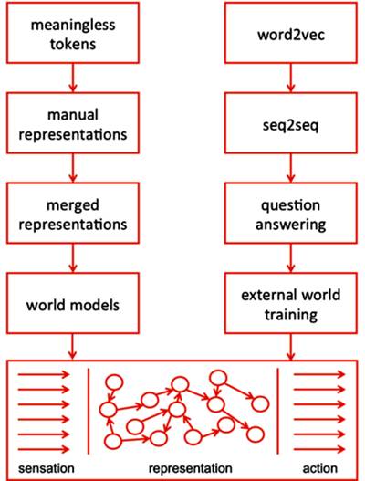 要让计算机理解人类的语言,现在一般有两条路。一是从形式语言入手,将文本切割为单词、标点这些没有意义的 token,把知识“硬编码”给计算机。研究者会把各种 token 组合起来手动地创造表征(representation),然后为这些表征赋予意义并使用它们构建模型。另一方面,也有人从神经网络或深度学习的角度入手,让计算机“学习”文本。在这条路上,词汇被表示为一个个的向量(word2vec),这些向量再进一步表示句子,然后回答问题。要走完这条路,研究人员必须开发算法,让计算机能像人一样学习语言。