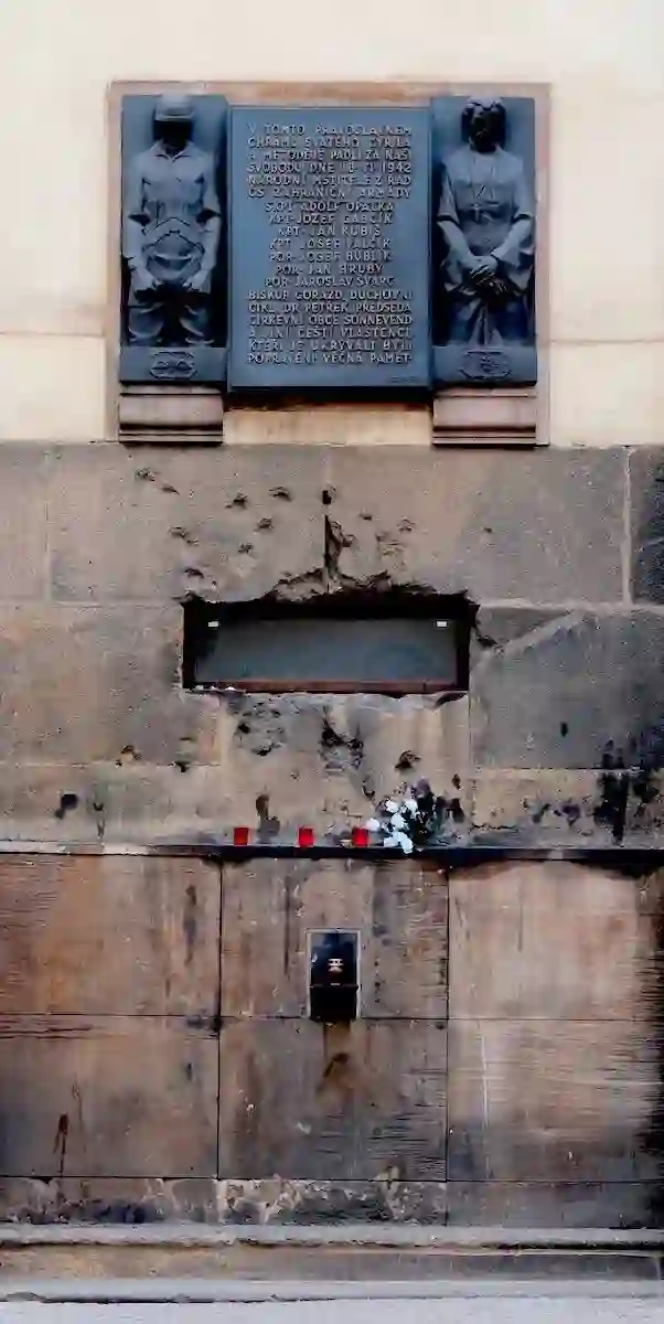 今天教堂外的纪念碑,当年的弹孔仍然保留,时常有人献花 摄于布拉格