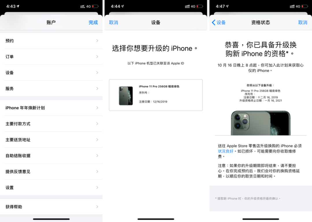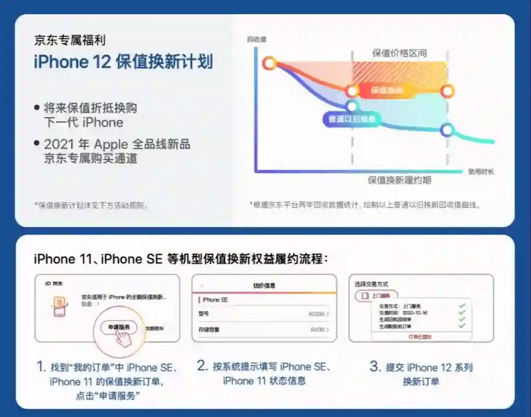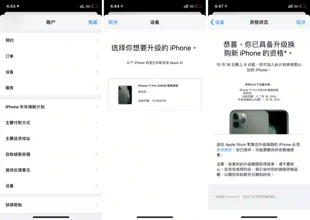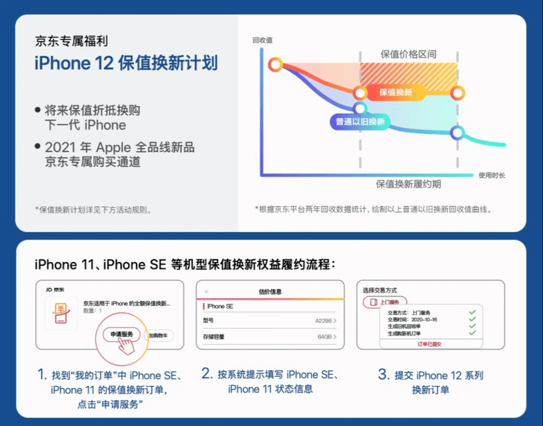 通过访问苹果官方网站或者下载 Apple Store 应用都可以预订新款 iPhone 12,持有招商银行、建设银行和工商银行信用卡的用户还可以享受 24 期免息分期,花呗用户在官网购买也可以享受 12 期免息分期。通过 Apple Trade in 计划,你也可以直接在官网折抵正在使用的 iPhone。如果你为现有 iPhone 购买了 AppleCare+ 并加入了「年年焕新」计划,可以选择前往线下 Apple Store 直营店,以设备原售价的半价加上 AppleCare+ 按照剩余服务时间的退款折抵新设备的价格。通过「年年焕新」预约升级 iPhone 12 系列设备的时间与直接进行购买相同,你需要在 10 月 16 日晚 8:00 之后预约 iPhone 12 或 iPhoen 12 Pro 的升级、或者在 11 月 6 日预约 iPhone 12 mini 或 iPhone 12 Pro Max 的升级。你可以在 Apple Store 应用中点击右上角的个人头像,找到「iPhone 年年焕新计划」选项,预约时会让你选择希望升级 iPhone 的型号和容量,并选择就近的 Apple Store 直营店和前往升级 iPhone 的时间;你也可以在官网查询「年年焕新」计划的状态并进行预约。关注少数派,在后台回复「买12」即可获得链接。需要注意的是,「年年焕新」只能在线下 Apple Store 直营店购买新 iPhone,购买新的 iPhone 不需要再次加购 AppleCare+ 或加入「年年焕新」计划,如果你希望继续加入「年年焕新」计划,可以在店内购买 iPhone 的时候告知店员。考虑到升级新 iPhone 时,原设备半价的折抵价格可能高于新设备的总价,我们向 Apple 客服询问了关于折抵价格高于新设备价格的处理方式,被告知通过「年年焕新」选择新 iPhone 时,不能选择售价低于原设备折抵价格的产品。关联阅读:iPhone、iPad 究竟要不要买「苹果保险」:AppleCare+ 详解