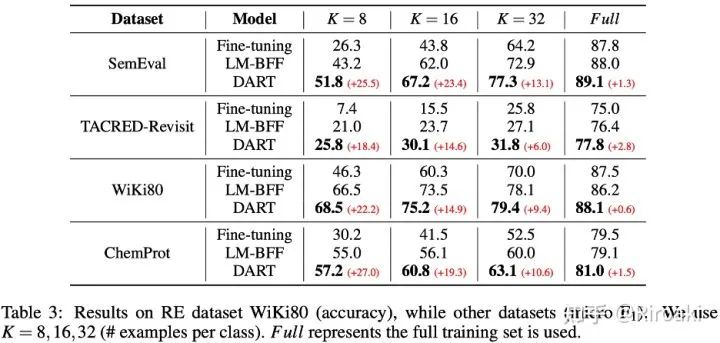 本文列出了DART模型在15个NLP数据集上的表现,包括情感分析、自然语言推理、释义、句子相似度、关系抽取和事件抽取的多种任务,其中涵盖主流的句子分类数据集如SST-2、MR、CR、Subj、TREC、MNLI、QNLI、MRPC和QQP等,以及多种关系/事件抽取数据集如SemEval 2010、TACRED-Revisit、Wiki80、Chemprot、ACE2005等,并与现有工作进行了对比。以下表格列出了主要的实验结果,具体的实验结果和分析可以参见论文。