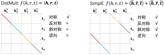 AutoBLM首先对评分函数建立了统一的表达形式及语义驱动的搜索空间。在现有的打分函数中,双线性模型(BiLinear Model, BLM)是一类比较好的模型,其表达能力强、复杂度低、建模效果好。图3展示了两个不同的双线性模型的表达式,以及他们的抽象矩阵表达,DistMult[4]和SimplE[5]不同的矩阵结构,决定了他们能否对各类关系进行建模。常见的关系类型包括对称性(如朋友关系),反对称性(如长辈关系),斜对称性(如属性关系),和逆向关系(如长辈和晚辈)。