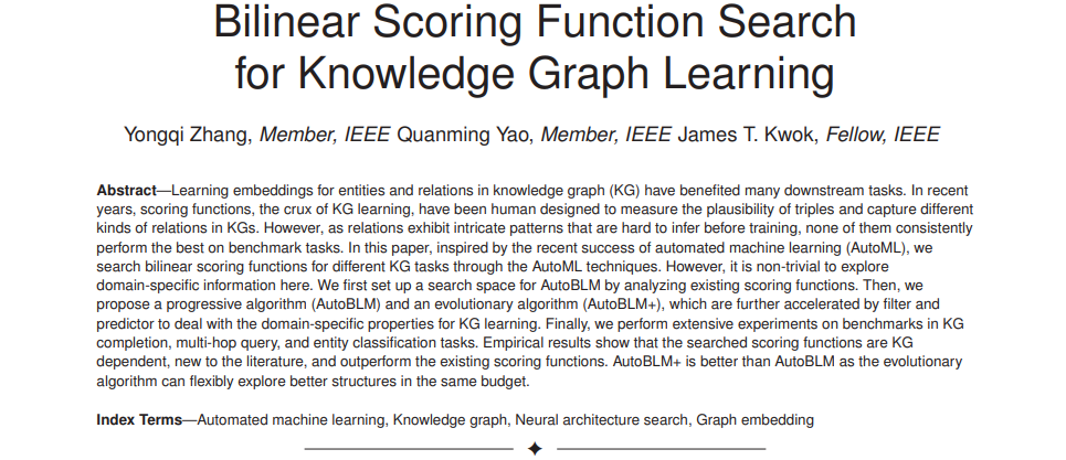 清华大学电子系机器学习课题组与第四范式和香港科技大学合作论文《知识图谱学习的双线性评分函数搜索》(Bilinear Scoring Function Search for Knowledge Graph Learning)近期发表于IEEE模式分析和机器智能学报(IEEE Transactions on Pattern Analysis and Machine Intelligence ,IEEE TPAMI)。