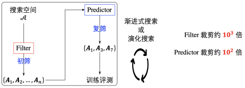 考虑到搜索空间非常巨大且训练和评估每一个结构都需要非常多时间,如何快速有效地搜索更好的结构,是搜索算法所需要关心的问题。AutoBLM在搜索算法的设计上,充分考虑了搜索空间的性质,在给定结构的基础上,对结构先进行一定程度的筛选,再进行模型评估,从而节省开销。如图5所示,AutoBLM利用Filter过滤掉一些非满秩、等价的结构进行初筛,再利用Predictor对结构的对称性特征进行评估,进一步筛选出可能较好地几个结构,对搜索空间进行大幅度的裁剪。在外层,AutoBLM利用渐进式搜索方式,AutoBLM+利用演化的搜索方式,不断迭代、优化,得到更好的结构。