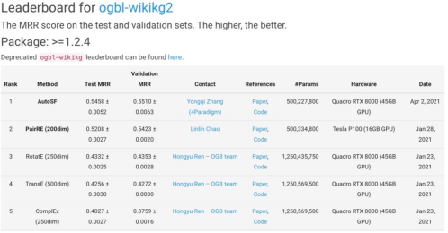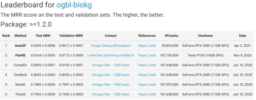 AutoBLM在知识图谱学习代表性任务链接预测上进行了实验,均超过了手工设计模型的效果。此外,AutoBLM还在大型生物知识图谱ogbl-biokg和维基百科图谱ogbl-wikikg2上表现优异,OGB[6]是目前公认的图学习基准数据集代表,由斯坦福大学Jure Leskovec教授团队建立,于2020年国际顶级学术会议NeurIPS上正式开源。以质量高、规模大、场景复杂、难度高著称,素有知识图谱领域“ImageNet”之称,AutoBLM曾在2021年4月分别拿到第一名成绩,刷新榜单记录(见下图AutoSF)。