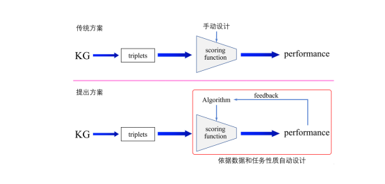 如图2所示,通常来说知识图谱领域的评分函数是人为定义设计的,这需要很强的专家知识,对任务、数据有着独到的理解。自动化的解决方案,算法根据模型效果的反馈,来自主设计评分函数,通过不断循环迭代来优化评分函数,实现在特定任务数据上低门槛,高性能的评分函数设计。