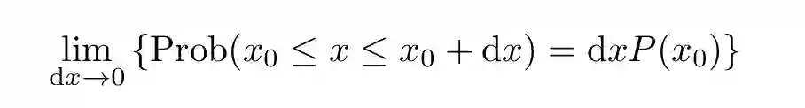 向连续型概率或者概率密度的推广是很直观的。假设有一个连续型随机变量 x 服从概率分布 P(x)。那么 x 位于 x_0 和 x_0+dx 之间的概率为: