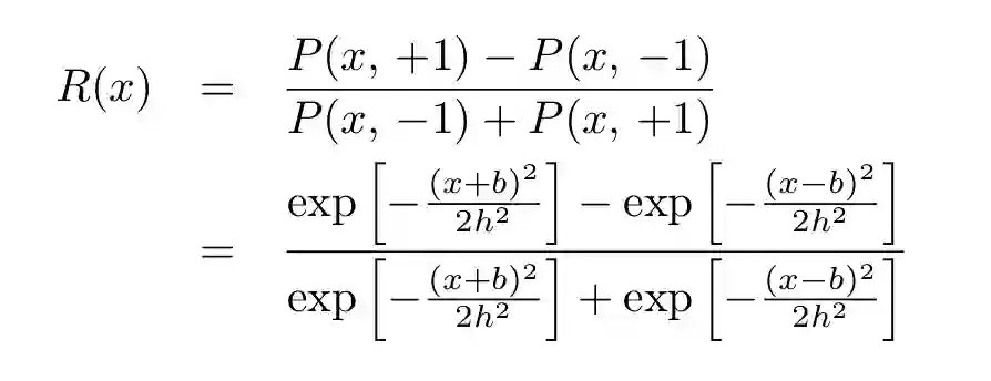 考虑一对形状相同的一维高斯函数,二者宽度 h 相等,期望值分别是-b 和+b。则条件概率的差异定义为: