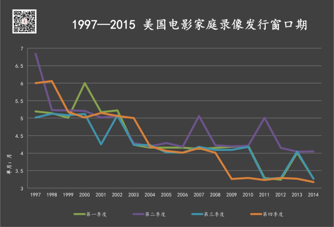 从1997年到2015年的近20年间,好莱坞电影的窗口期在不断缩短。进入2012年以后,六大影业的窗口期已经从将近6个月缩短到了90天。