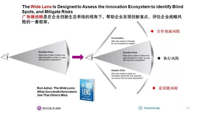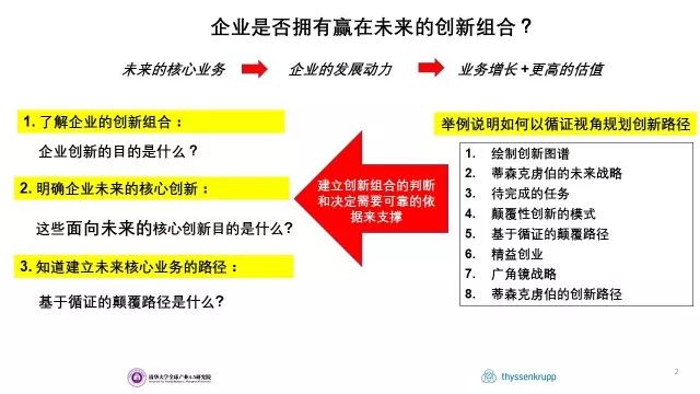 那么,如何才能找到可靠的依据,来帮助企业建立符合长远战略的创新组合,进而成功打造未来的核心业务呢?徐亚丁博士在分享中分别就颠覆性创新模式、精益创业理论、广角镜战略等理论和工具,在帮助大企业识别出未来核心业务的特征,以及预判企业的创新是否具有颠覆的可能等方面的作用,进行了详细地阐释。此外,他还以蒂森克虏伯为例,介绍了其未来战略中的商业构思及其创新的路径。