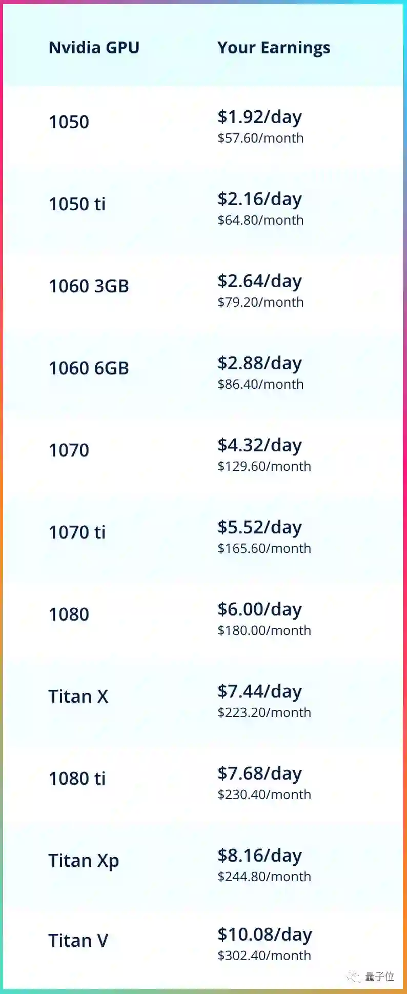 官方网站上针对各种GPU给出了一个清晰的价目表:赚得最少的老GPU 1050,每天1.92美元;Titan V赚的最多,每天10.08美元。