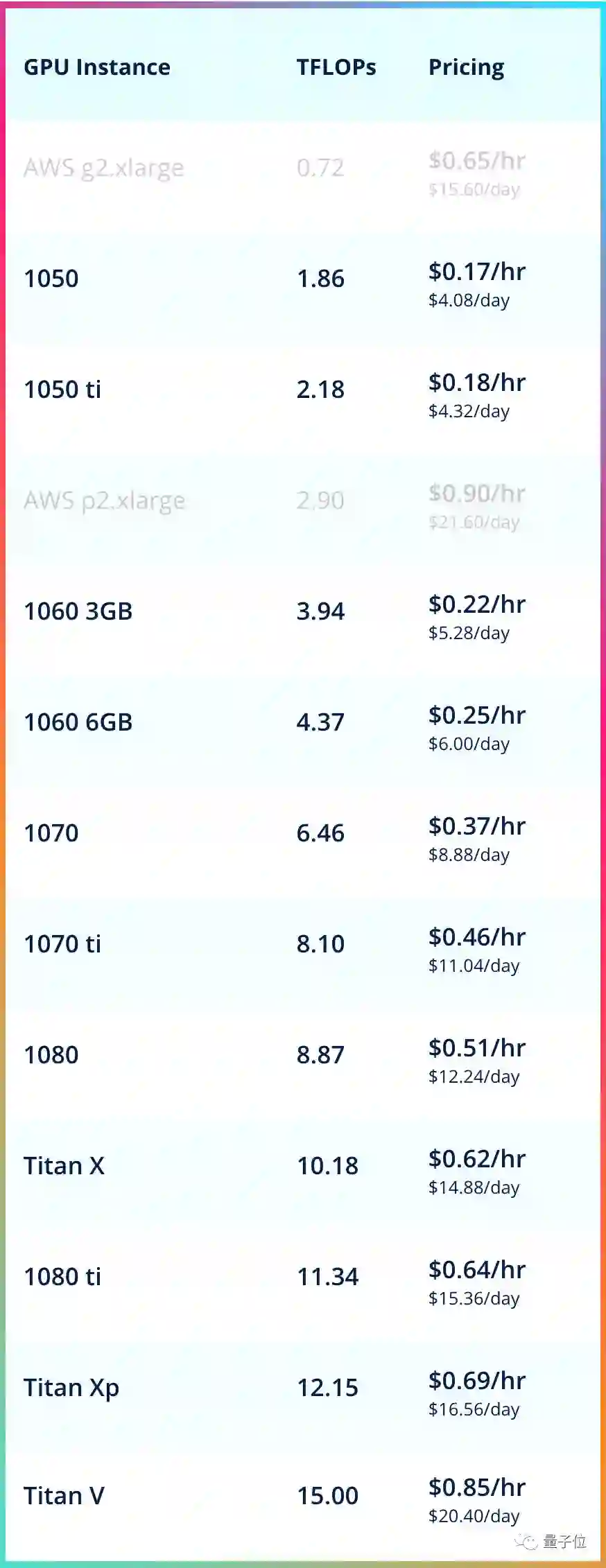 GPU提供方赚的比挖矿多,但是开发者租到的GPU实例并不贵。每小时0.17美元起,仅仅是AWS的1/5,租个最新的Titan V,每小时才0.85美元。
