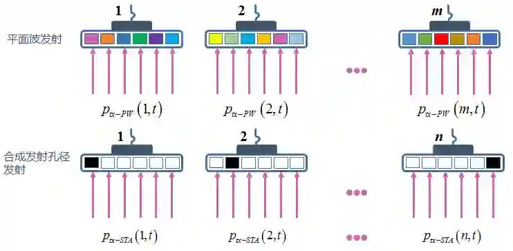 平面波和合成发射孔径的关系示例:第一行为m次平面波发射,每次发射接收到的数据为