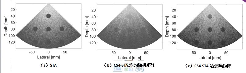 64次发射的(a)STA,(b)采用均匀随机矩阵的4次发射的CS-STA,和(c)采用哈达玛矩阵的4次发射的CS-STA。可以看到,采用哈达玛矩阵的CS-STA能提高STA的对比度,并能获得比均匀随机矩阵更佳的图像质量。
