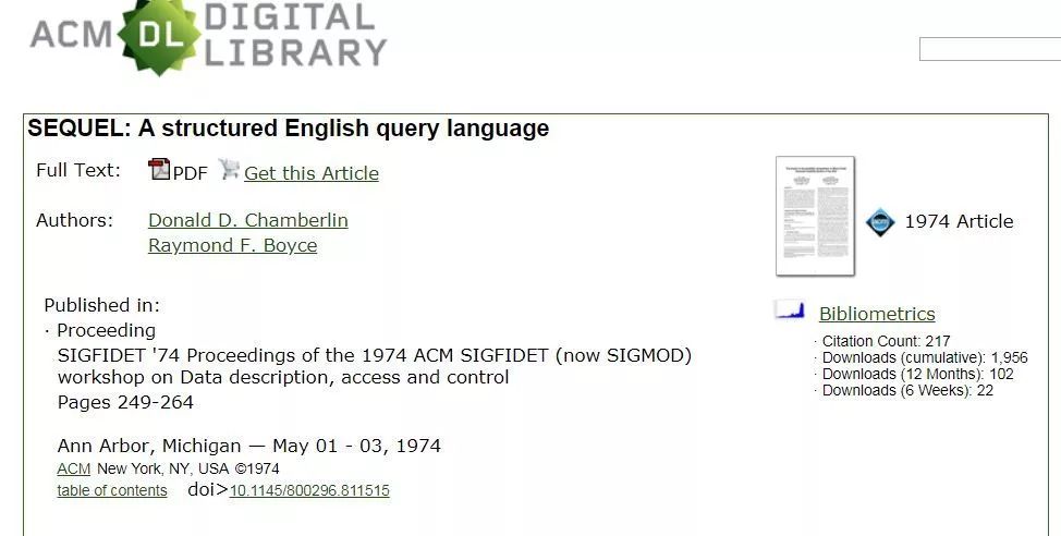 1974年的时候,Donald Chamberlin和Raymond Boyce发表了一篇论文:SEQUEL: A structured English query language。为了给大家看看这篇论文怎么样,我特意去ACM的数据库里搜了一下,截图如下: