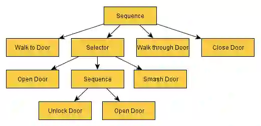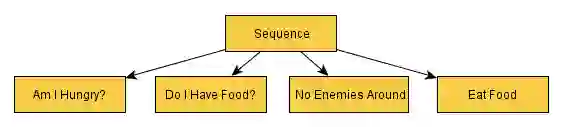 行为树的工作方式是从左到右询问问题。一个成功允许沿着树前进,而失败将会返回到序列节点。过程如下:序列→我饿了吗?(成功)→序列(运行)→我有食物吗?(成功)→序列(运行)→周围没有敌人(成功)→序列(运行)→吃东西(成功)→序列(运行)→父节点(Simpson,2014 年)。如果在任何时刻,其中一个节点返回(失败),那么整个序列都将会失败。例如,如果结果是“我有食物吗?”失败了,它就不会再检查周围是否有敌人,也不会再吃东西。相反,这个序列将会失败,而这将是该序列的结尾。