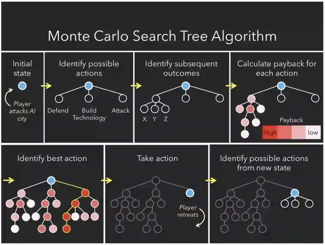 有限状态机算法并不适用于每款游戏。试想一下,如果在策略游戏中使用有限状态机会发生什么?如果机器人被预编程,每次都以同样的方式做出响应,那玩家将会很快学会如何智胜计算机。这就产生了重复的游戏体验,正如你所预料,这并不会让玩家感到愉快。为了防止有限状态机的重复性,人们提出了蒙特卡洛树搜索(Monte Carlo Search Tree ,MCST)算法。蒙特卡洛树搜索的工作方式是首先可视化机器人当前所有可用的动作。然后,对于每个可能的动作,它分析玩家可能会做出响应的所有动作,然后它会考虑所有它可能做出的响应动作,等等(Lou,2017 年)。你可以想象这棵树将会以多快的速度变成“参天大树”。下面是一幅很不错的图表,可以直观地了解蒙特卡洛树搜索是如何工作的:
