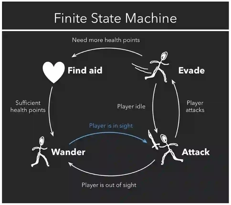 人工智能是一个非常宽泛的术语。它不一定需要是一个从玩家行为中学习的模型。《德军总部 3D》(Wolfenstein 3D)早在 1992 年就发布了,就连游戏中的士兵也有一个基本的人工智能形式。有限状态机(Finite State Machine,FSM)算法是一种相对简单的人工智能,设计者在其中创建一个机器人可以经历的所有可能事件的列表。然后,设计者分配机器人对每种情况的具体响应(Lou,2017 年)。我们可以想象,在 1992 年,《德军总部 3D》的开发者考虑了敌军可能遇到的所有情况。在他们的视野之内,一扇门可能会打开,Blazkowicz(《德军总部》系列游戏中的英雄)可能会走进他们视野内,他们可能会从他背后开枪射击,他们也有可能看不到 Blazkowicz,等等。开发人员会编制这个列表,并针对每个情况,告诉机器人应该去做什么。这是 Lou 的文章中一张有用的图片: