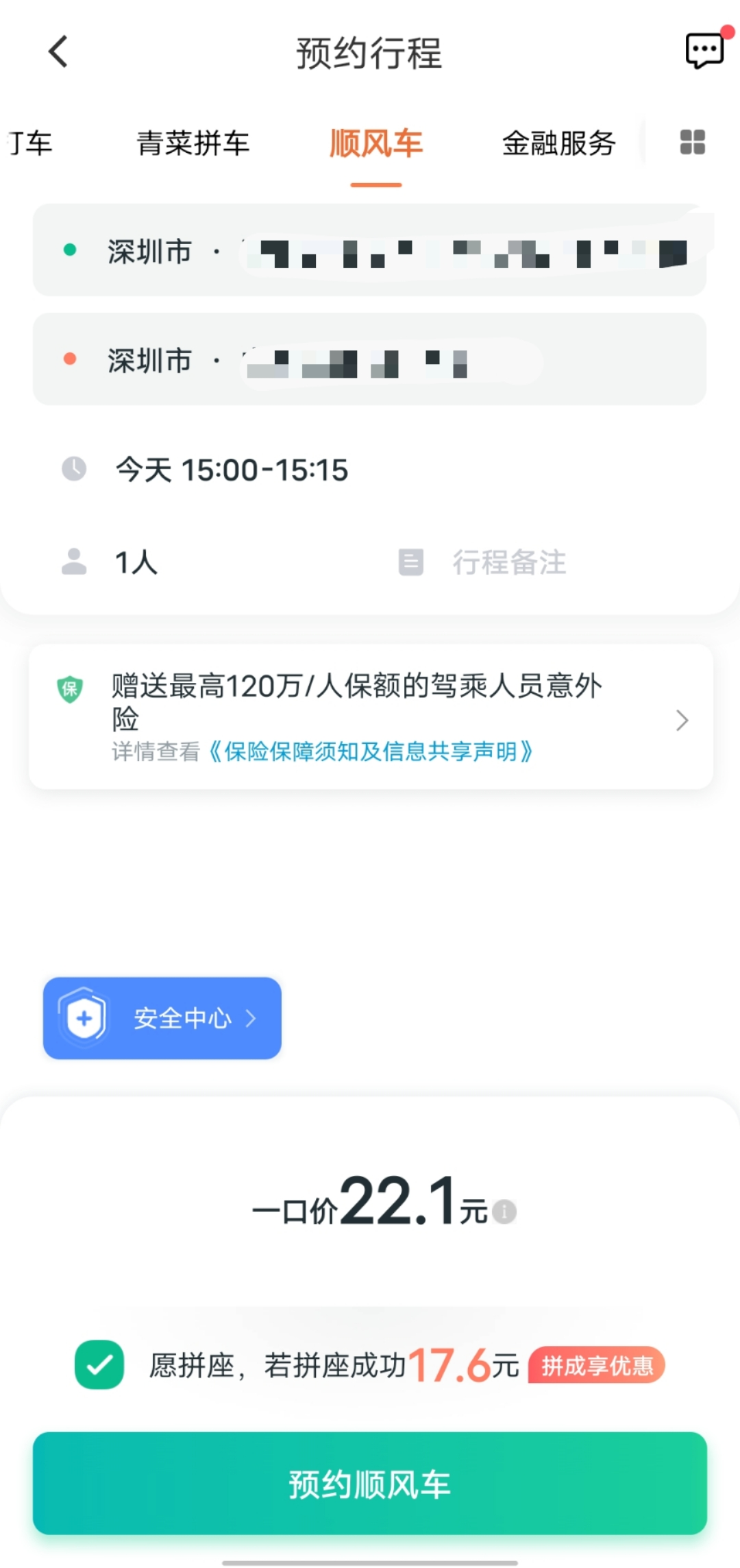 虽然拼车业务已经改名并拥有独立入口,但在使用快车时仍然可以勾选 “ 接受拼车 ”,价格仍然保持过往的 6.5 折,并非与 “ 青菜拼车 ” 同等价格。目前 “ 接受拼车 ” 与 “ 青菜拼车 ” 可勾选时间仍然为 6:00~23:00 点,勾选后乘客不能更改目的地。