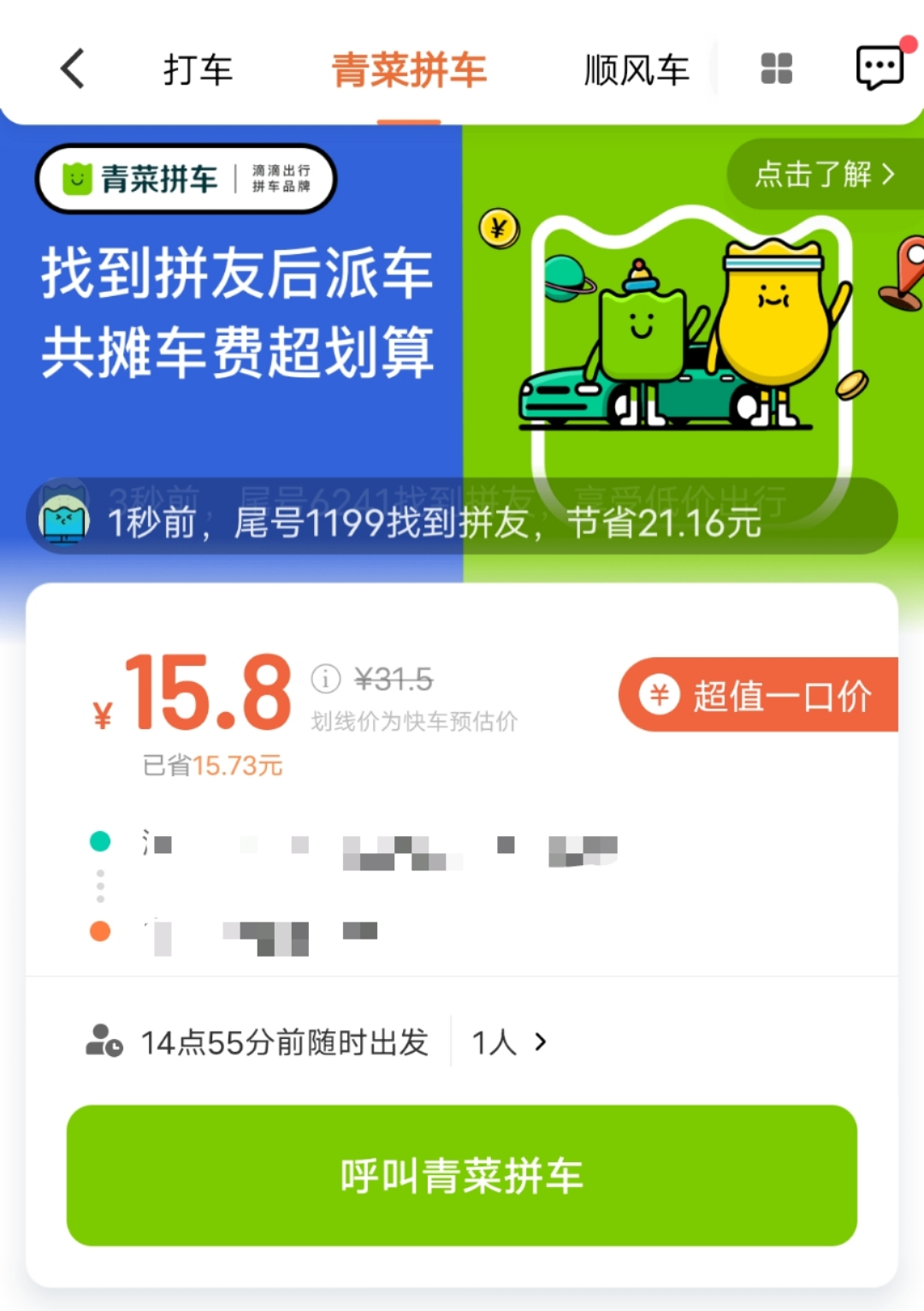 而 “ 拼成出发 ” 功能,也就是现在的 “ 青菜拼车 ” 则是针对的是 “ 会省钱星人 ”,让用户在出发时,就能满足以拼成一口价乘车的需求。用户可在拼车独立页面提前发单,系统将先匹配拼友再叫车。