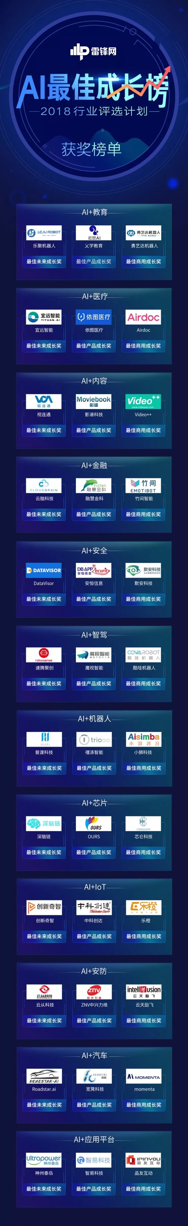 以下就是备受瞩目的 2018 年度 AI 最佳成长奖榜单: