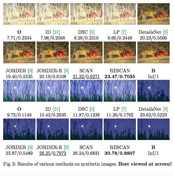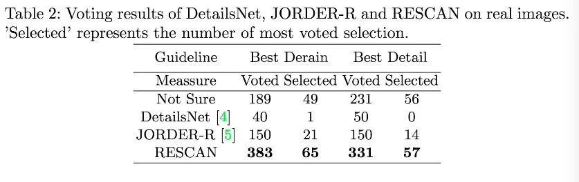 主观评价方法,通过对127幅图像6个人的投票调查,选择最佳去雨效果和保留的最佳细节的图像。RESCAN取得了压倒性优势。