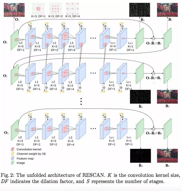 3.由于雨水条纹层彼此重叠,因此在一个stage中不容易完全除去雨水。因此进一步将雨水分解分为多个stage。结合递归神经网络保留先前阶段中的有用信息并有利于后期的除雨。