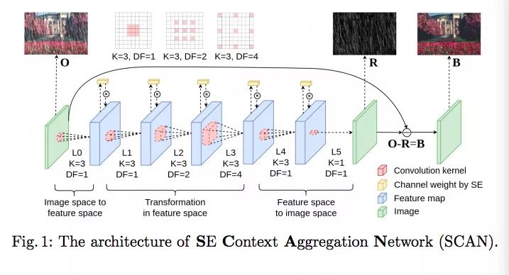 1.由于背景信息对于定位雨水位置非常重要,该文首先使用了扩张卷积神经网络(dilated convolutional neural network )来获取大的感受野,同时为更好地适应去雨任务修改了扩张卷积网络。