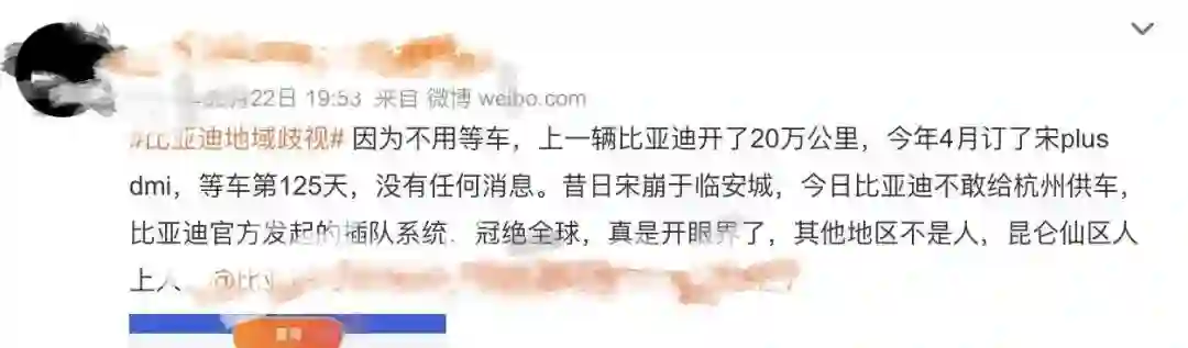 但无论销售是否All in维系客户,都很难安抚用户的不满情绪。因为有车主发现,并非所有区域的提车周期都那么漫长。从2021年5月开始,就有比亚迪用户在社交平台发帖吐槽,重庆、江苏等地区的用户50天就可提车,其他地区的用户却要等3个月乃至更长的时间。