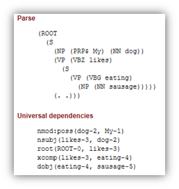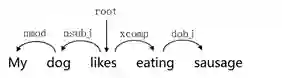 根据不同的标注树库,句法分析树主要有两种形式:1) 短语结构树(Constituent Tree) 和2) 依存结构树(Dependency Tree)。下面举个简单的例子,"My dog likes eating sausage." 使用Stanford parsing tool进行句法分析可以得到如下结果: