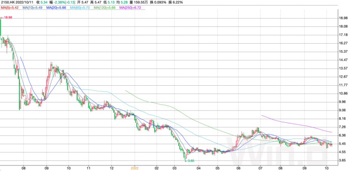 反观在早已登陆港股市场的奈雪的茶(2150.HK),同期的营收为43亿元,净亏损45亿元,经调整净亏损1.45亿元,去年6月上市至今,股价已从18.98元/股一路下跌至5.34元/股,股价跌幅达70.65%,市值缩水230亿元。