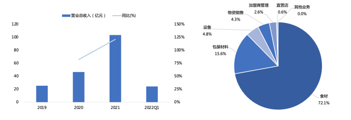 乘着现制茶饮赛道的东风,蜜雪冰城也迎来了业绩的高增。2019-2021年,蜜雪冰城营收的年复合增长率为100.8%,2021年,蜜雪冰城实现营收103.51亿元,同比增长121.2%,2022Q1,蜜雪冰城实现营收24.34亿元。