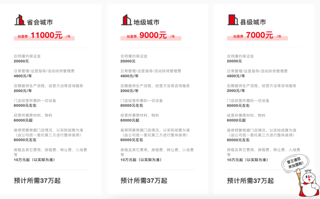 回本周期上,官网数据显示,蜜雪冰城新店开业成本在37万左右。按照上文的计算,蜜雪冰城门店的销售额合计在210-280亿元,食材和食品包装成本合计为60.86亿元,2021年的加盟商数量平均为1.65万家。