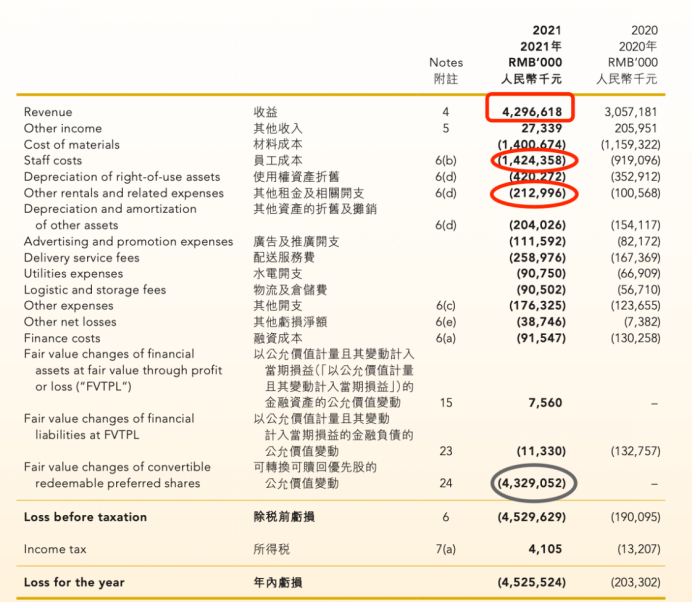 2021年,奈雪员工成本与租金成本合计达到了16.37亿元,占到了营收的38.1%。在剔除了可转换可赎回优先股的公允价值变动科目后,奈雪依然存在1.45亿元的亏损。所以,直营模式下,巨大的员工与租金开支都需要奈雪自负,公司亏损也就不难理解了。
