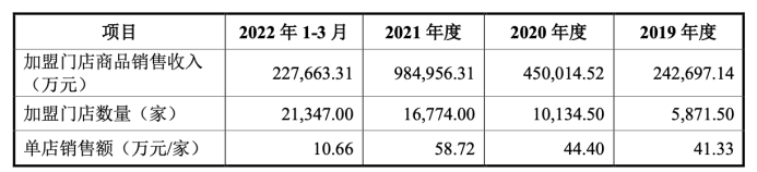 近年来,蜜雪冰城加盟门店数量以及单店销售额的双增带动了业务规模的快速扩大。2019-2021年,蜜雪冰城的加盟门店数量从7186家增长至20465家,年平均净增加6643家,截至2022Q1末,加盟门店数量达到了22229家,成为国内门店数量最多的茶饮品牌;单店销售额也从2019年的41.33万元/家提升至2021年的58.72万元/家。