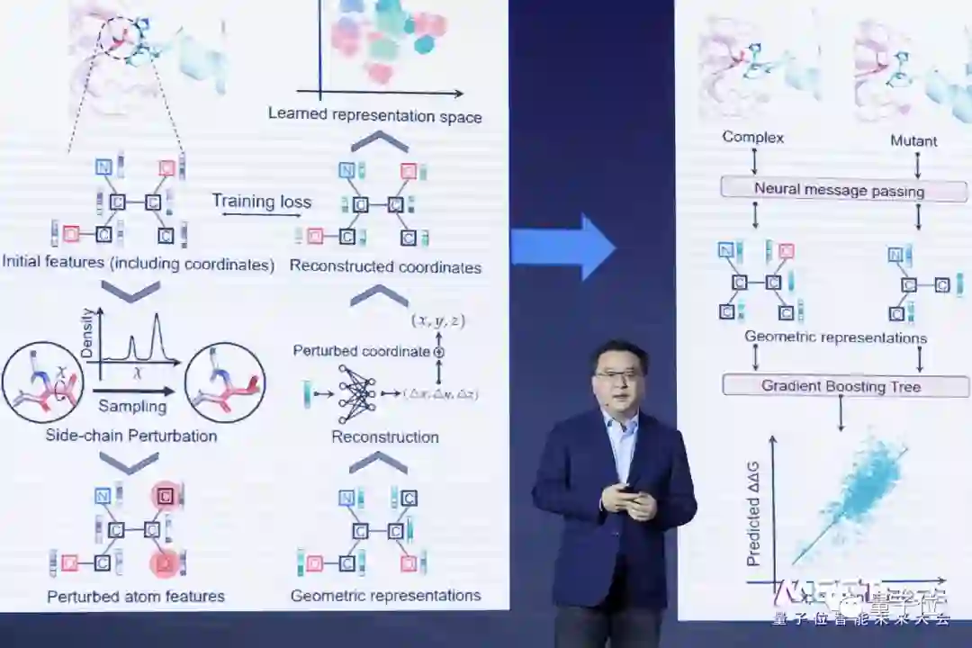 另外,彭健教授团队还把几何深度学习用到AI抗体的开发。目前虽然蛋白质序列大幅度被解析出来了,但是其本身的形状几何结构还有很多的变化,他们想做的就是把蛋白质表面的几何表征用深度学习方法去表示出来,然后做抗体亲和力预测。