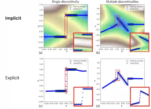 拟合不连续函数的示例,隐式模型(上图),与之相比的显式模型(下图)。红色部分突出显示的插图显示了隐式模型可表示不连续性,见 (a) 和 (b),而显式模型必须在不连续点之间绘制连续线,见 (c) 和 (d)