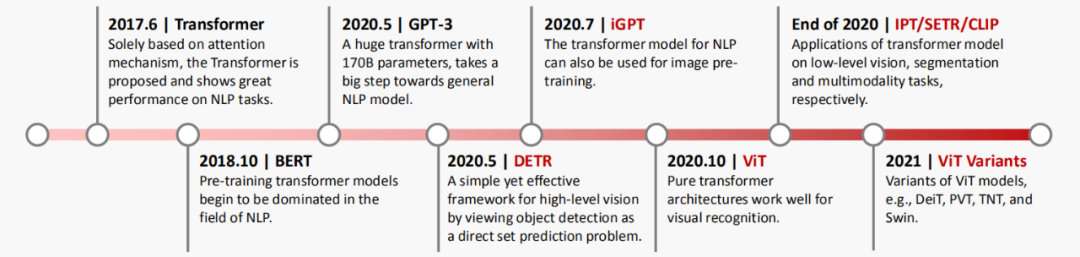 图 1 展示了视觉 Transformer 的发展里程碑,从图像分类到目标检测,从图片生成到视频理解,视觉 Transformer 展现出了非常强的性能。
