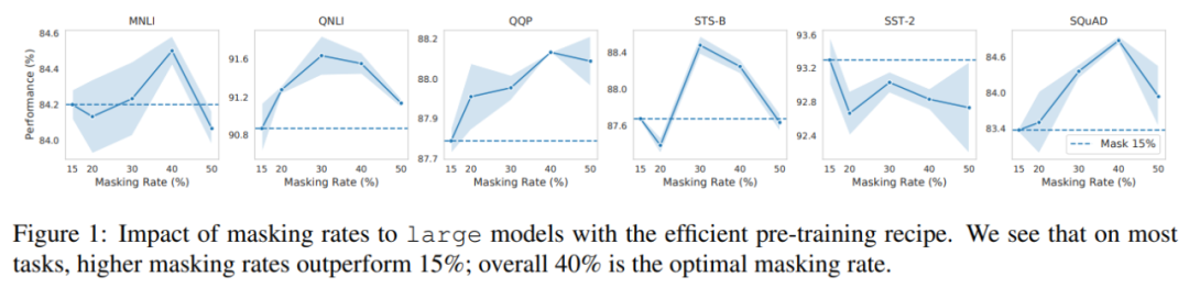 在普林斯顿大学陈丹琦等人的研究中,作者发现了与此前结论完全不同的情况:在有效的预训练方案下,他们可以掩蔽 40-50% 的输入文本,并获得比默认的 15% 更好的下游性能。