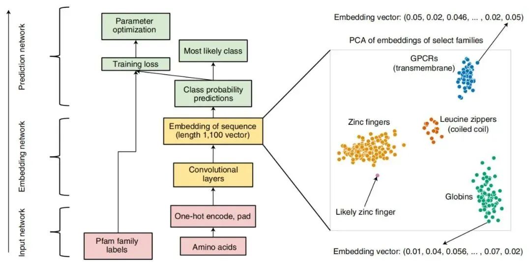 ProtCNN 的架构。中心图展示了输入(红色)、嵌入(黄色)和预测(绿色)网络以及残差网络 ResNet 架构(左),而右图展示了 ProtCNN 和 ProtREP 通过简单的最近邻方法利用。