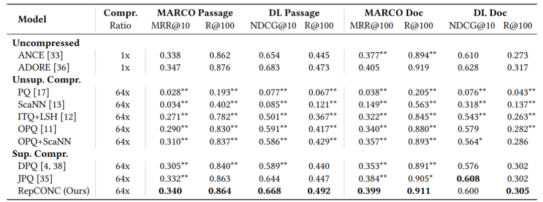对两个流行的 ad-hoc 检索基准进行的大量实验表明,在多种压缩比设置下,RepCONC 比其他向量量化基准实现了更好的排序效果,它在检索效率、记忆效率和时间效率方面也大大优于现有的各种检索模型。