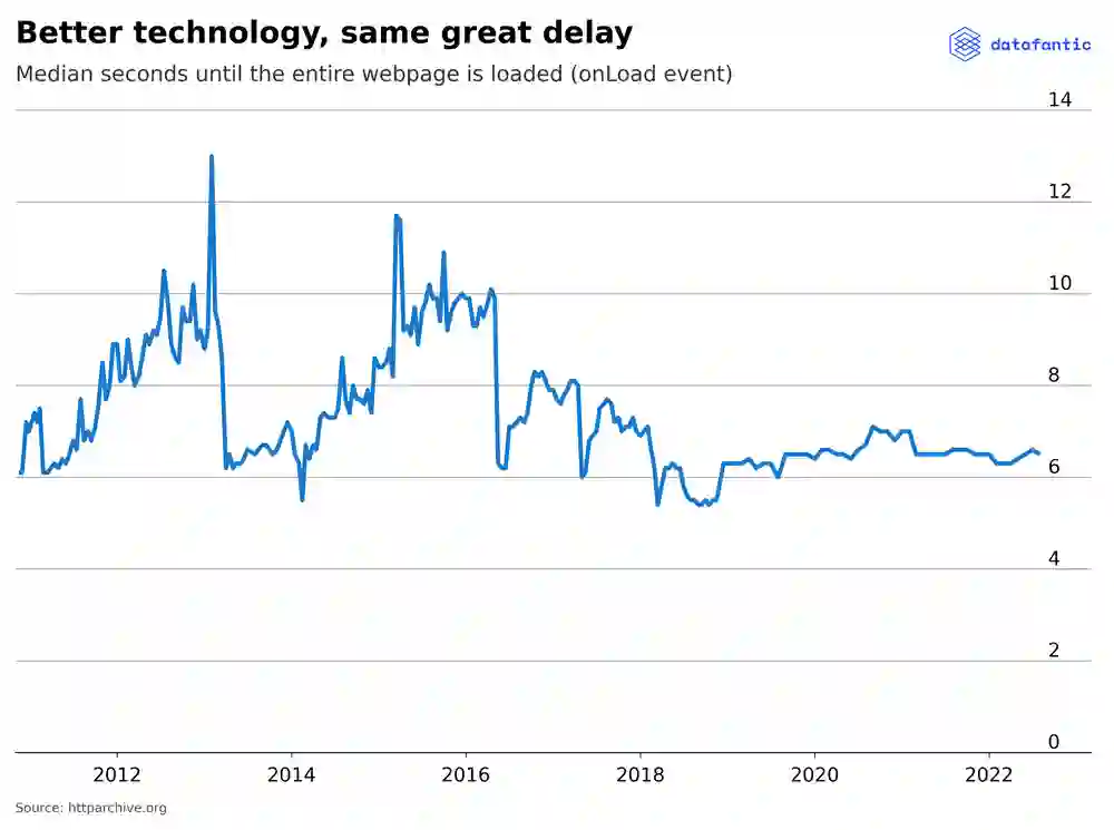 从 2022 年回顾前十年,只有2014年、2018年以及2018年后的三段时间里,网络加载速度的中位数是低于 6 秒。自2019年以来,网速就已经开始停滞不前。