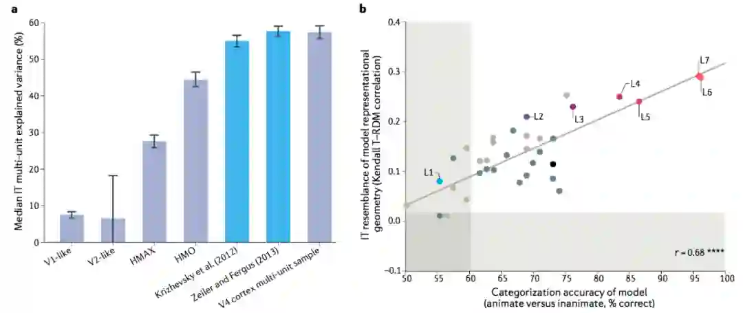 a:反向传播训练的模型(蓝色)比其他模型(灰色)更好地解释了颞下皮质层的多单元反应。b:具有更好分类性能的模型与颞下皮质层表示更为相似。
