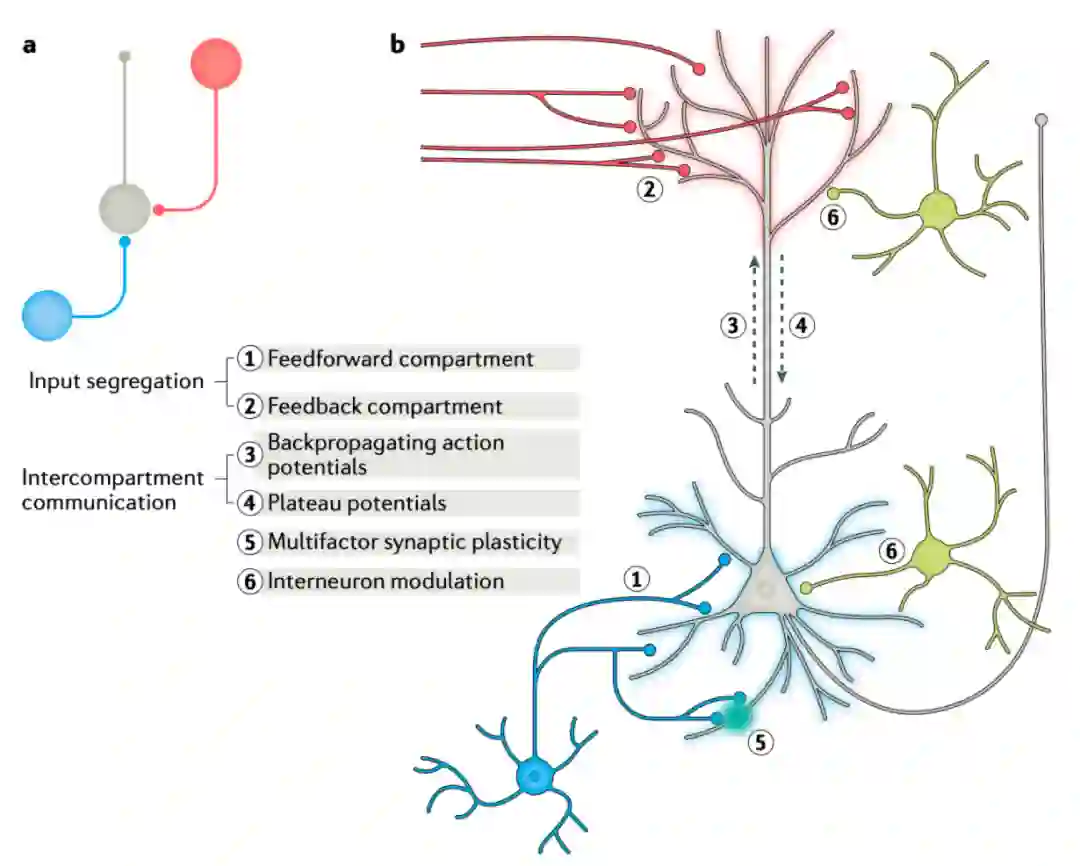 每个区室的可塑性可以取决于自身突触事件和另一区室中触发的事件(5)。例如,顶端产生的平台电位的到来可能会改变“向前”的基础突触可塑性。最后,局部抑制性神经元(黄色细胞)可以调节亚细胞区室之间的通讯,并且自身可以被高阶输入差异性地募集,从而可以调节正向和反向路径之间的相互作用(6)。