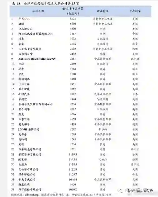 打破这种限制,我认为有一种很好的办法,就是“对标”,即将中国当前的股票市场与国外成熟市场的股票市值对比一下,庶几,或许能大大开拓我们投资的视野。比如,最近,我看到如下一篇材料,即由国国泰君安证券研究提供的截止2017年8月10日,全球前35家超过1000亿美元市值的公司的图表。从这个图表中,不难看出,我们中国A股公司,哪怕它再优秀,其市值是不是也太小儿科了?