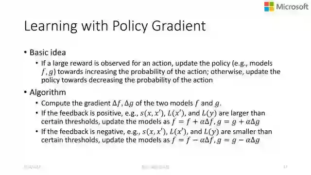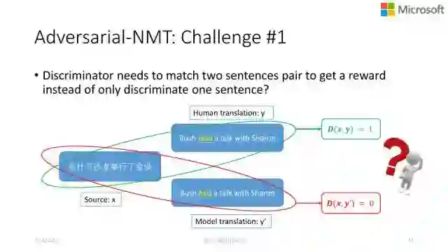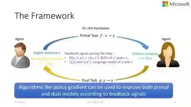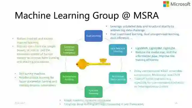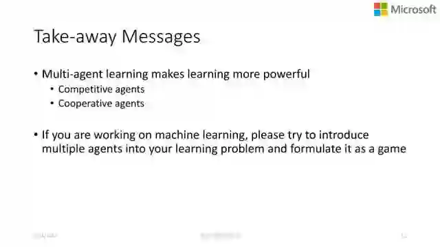 微软亚洲研究院的秦涛主管研究员做了“从单智能体学习到多智能体学习:GAN,对偶学习等”的报告,从协同式多智能体学习、竞争式多智能体学习、协同和竞争共存式多智能体学习三方面,阐述了微软亚洲研究院关于多智能体学习的最新研究,讨论了对偶学习如何提高学习效率,包括从未标记数据中学习(双向无监督学习)、从已标记数据中学习(双向监督学习)和推理(双向推理),并介绍了对抗神经机器翻译的相关工作。