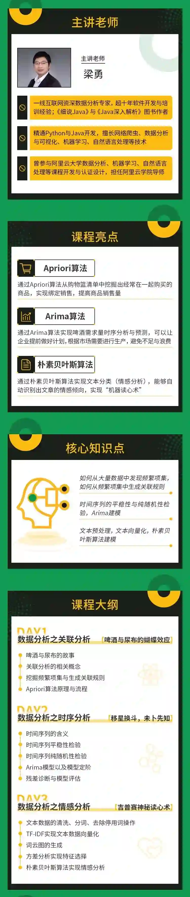 此次训练营邀请了有多年一线互联网数据分析经验的梁勇老师(老梁)授课,他曾担任阿里云导师并参与了数据分析、机器学习等课程开发和认证设计。