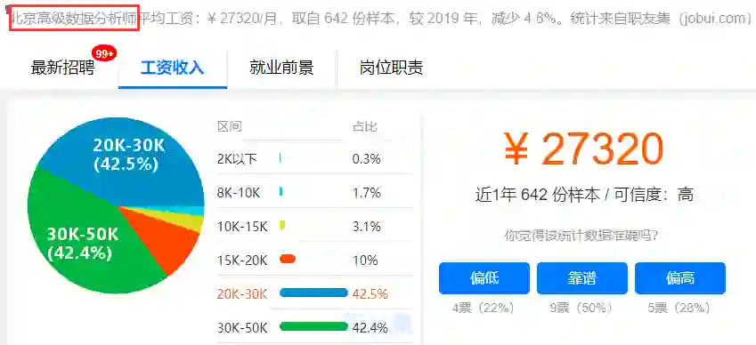 但实际工作中,不同数据分析师的薪资会有很大差别,以北京地区为例(如下图):数据分析师平均工资可达19k,但高阶分析师、挖掘工程师、算法工程师等高端职位,平均工资超过27k,薪水竞相差8k之多!!
